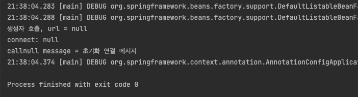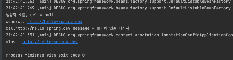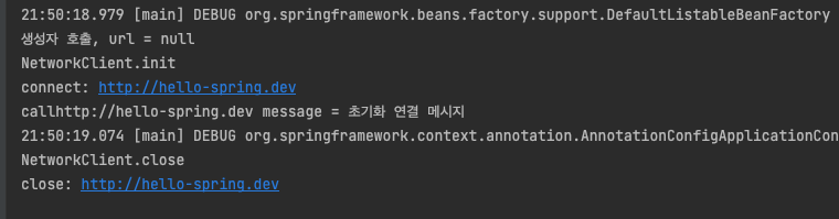 스프링 컨테이너의 종료가 호출되자 소멸 메서드가 호출되었다.