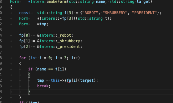 인턴들은 makeForm()ㅣ라는 함수가 있습니다. 이 함수는 2개의 string변수가 필요해요. 하나는 서류의 이름을 담을거고, 나머지는 form의 대상이 될겁니다. 이것은 Form객체의 포인터를 반환합니다.
