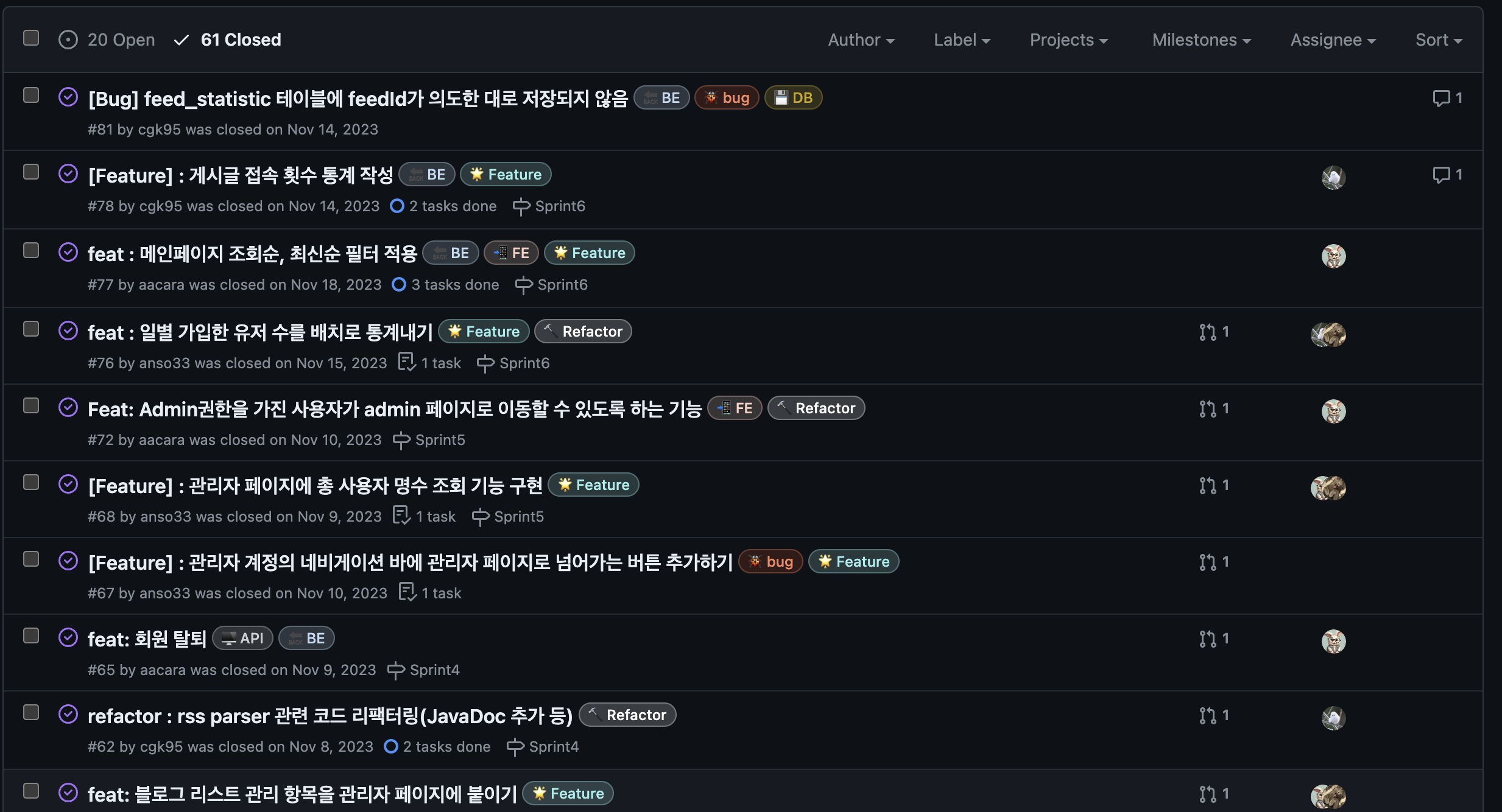 이때 스프린트마다 목표했던 Task의 완료상태를 한눈에 볼 수 있도록 마일스톤을 이용하여 아래와 같이 관리하였다.