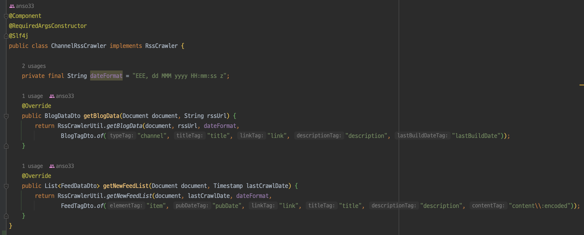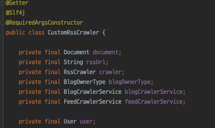 CustomRssCrawler는 최종적으로 각 블로그(유저)마다 가지는 크롤러 객체로 아래의 사진과 같이 블로그의 rss형식 문서, rssUrl, 유저 정보, 비즈니스 로직을 처리해 줄 Service 객체, 그리고 해당 블로그의 rss 형식에 맞춰 크롤링해 줄 크롤러를 멤버 변수로 가진다.