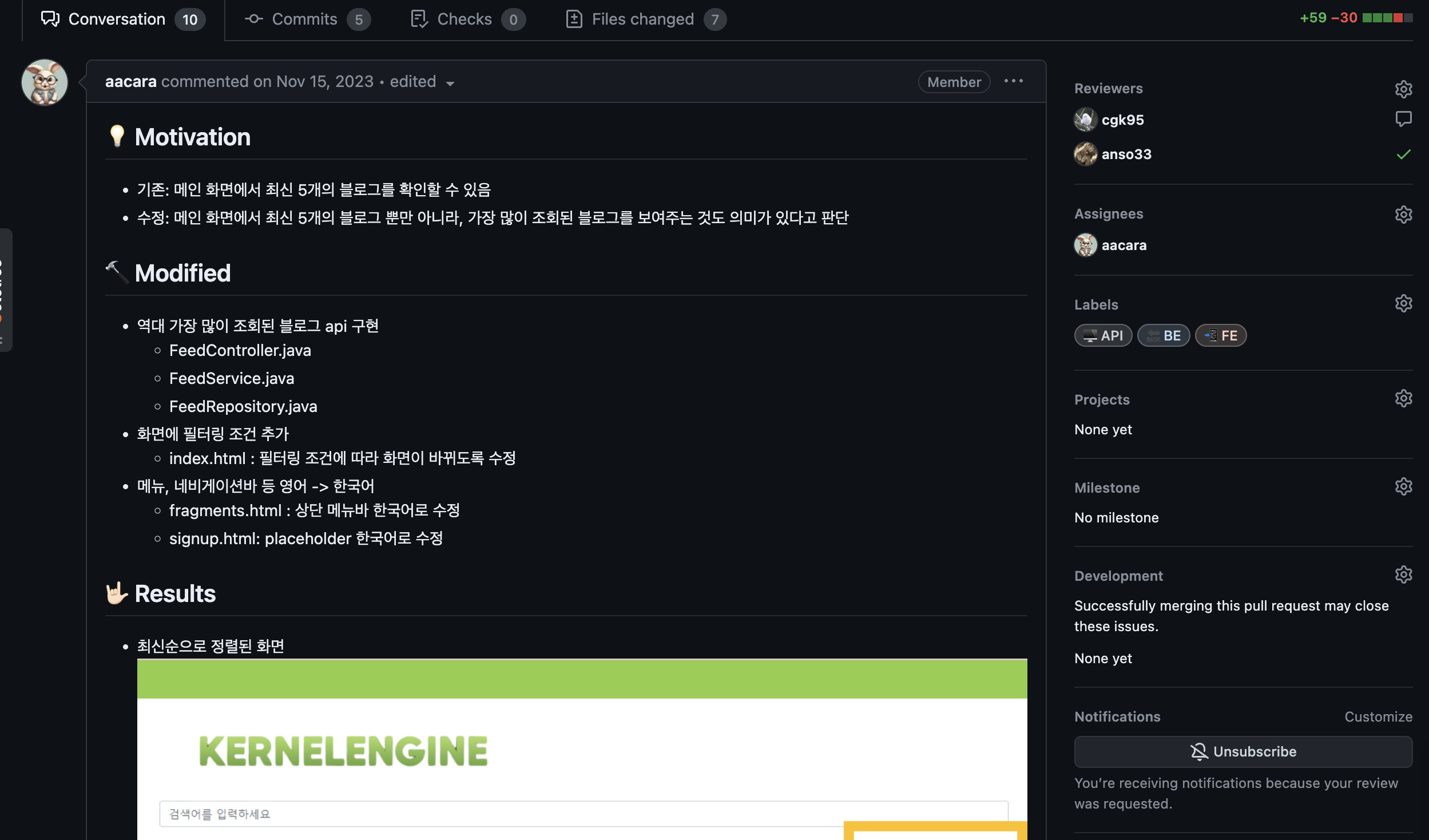 작업을 마무리 했을 때는 아래와 같이 왜, 무엇을, 그래서 결과가 무엇인지를 자세하게 설명하여 팀원들이 어떤 코드인지 이해하고 리뷰할 수 있도록 했다.
