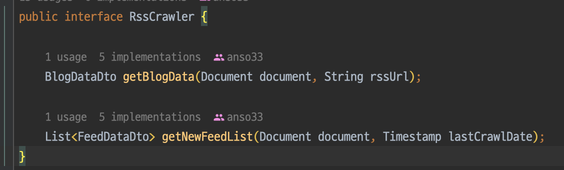..... 아..ㅋㅋ 솔직히 RssCrawlerFactory는 RssCrawler Impl을 찾기 위한 else if 떡칠이라서 이렇게 사진으로 넣기 창피한데...! 앞으로 개선할 거니까! 더 나아지는 과정 중 일부니까! ㅋㅋㅋㅋㅋ 아무튼아무튼 이 Factory를 통해서 블로그에 맞는 크롤러를 찾아준다.