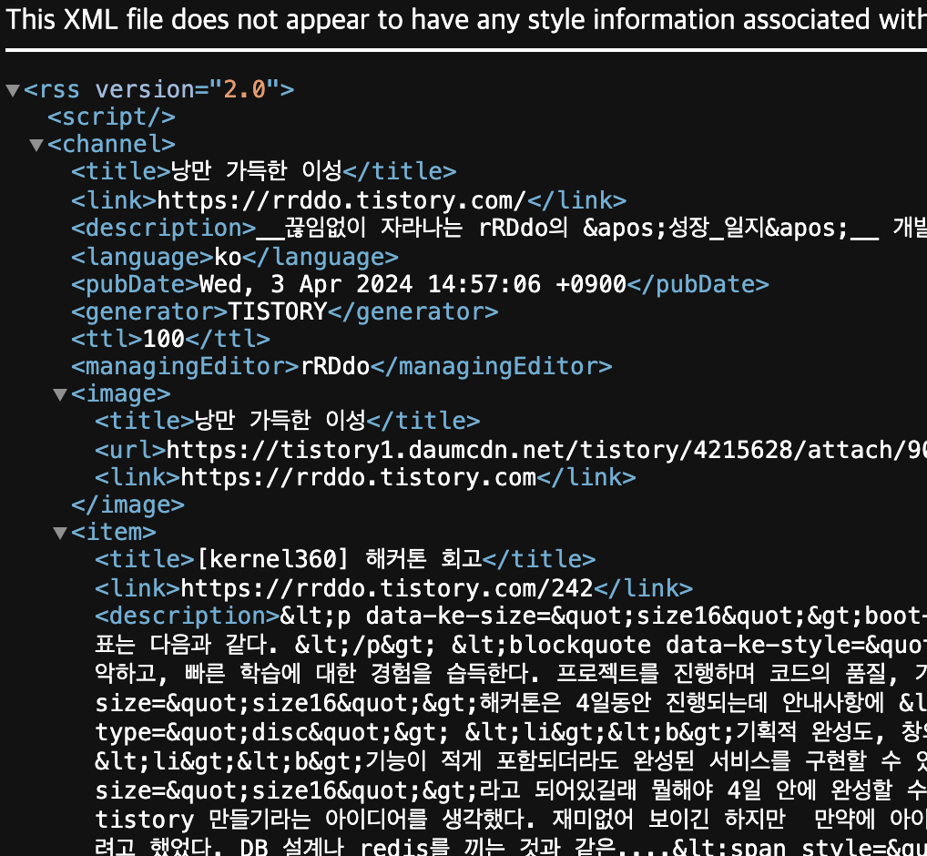 바로 개발 블로그의 플랫폼이 tistory, velog, medium 부터 github까지, 이 외에도 다양한 종류가 있었고 심지어 같은 플랫폼에서도 사용자가 custom 한 블로그들이 존재한다는 것이었다..... 언제 다 크롤링해..... 아무리 머리를 싸매봐도 각 블로그마다 그에 맞는 custom crawler를 개발해야한다는 결론으로 수렴했다. 하지만 우리에게 주어진 시간은 한 달뿐..... 이때 우리는 rss라는 형식을 알게 되었다!