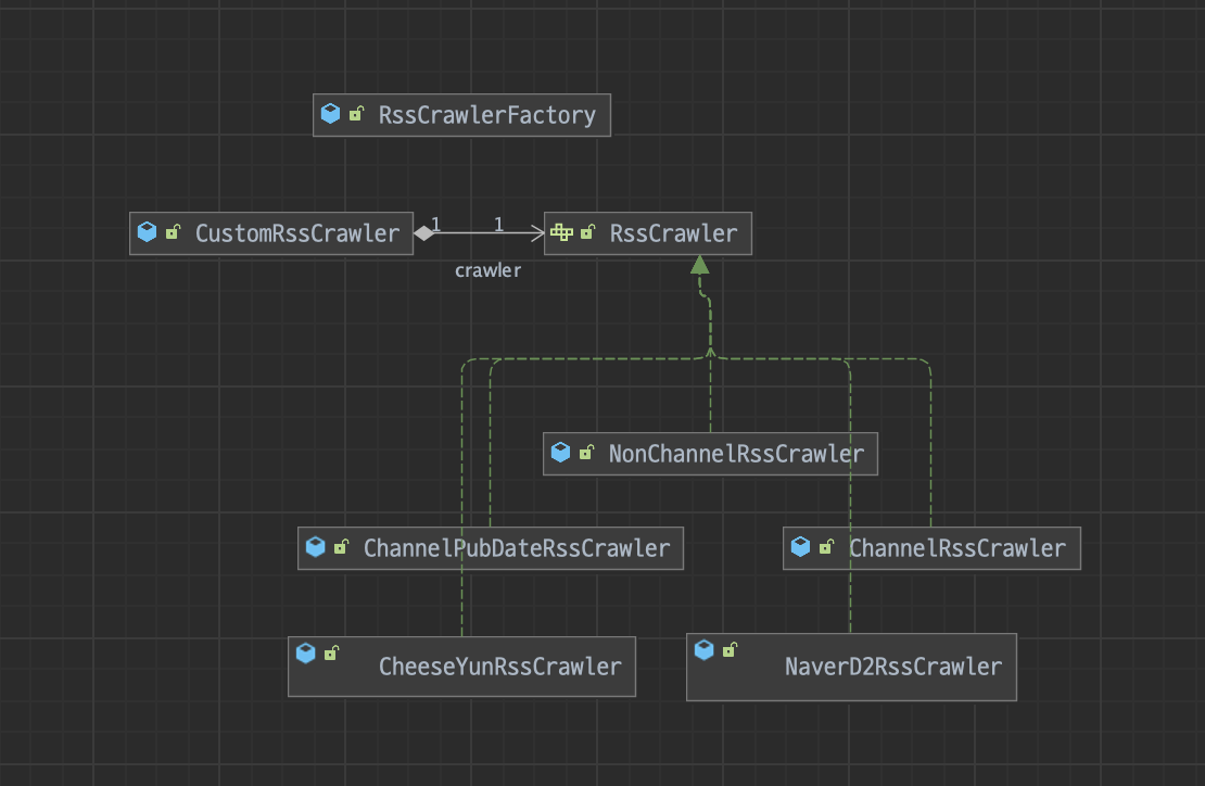 따라서 그냥 일반 클래스로 두고 필요한 정보를 조립해서 사용할 수 있도록 구성했다. 다만 블로그의 rss 형식에 맞는 크롤러를 찾아주는 관리자가 필요한데 그 역할을 하는 것이 RssCrawlerFactory이다.