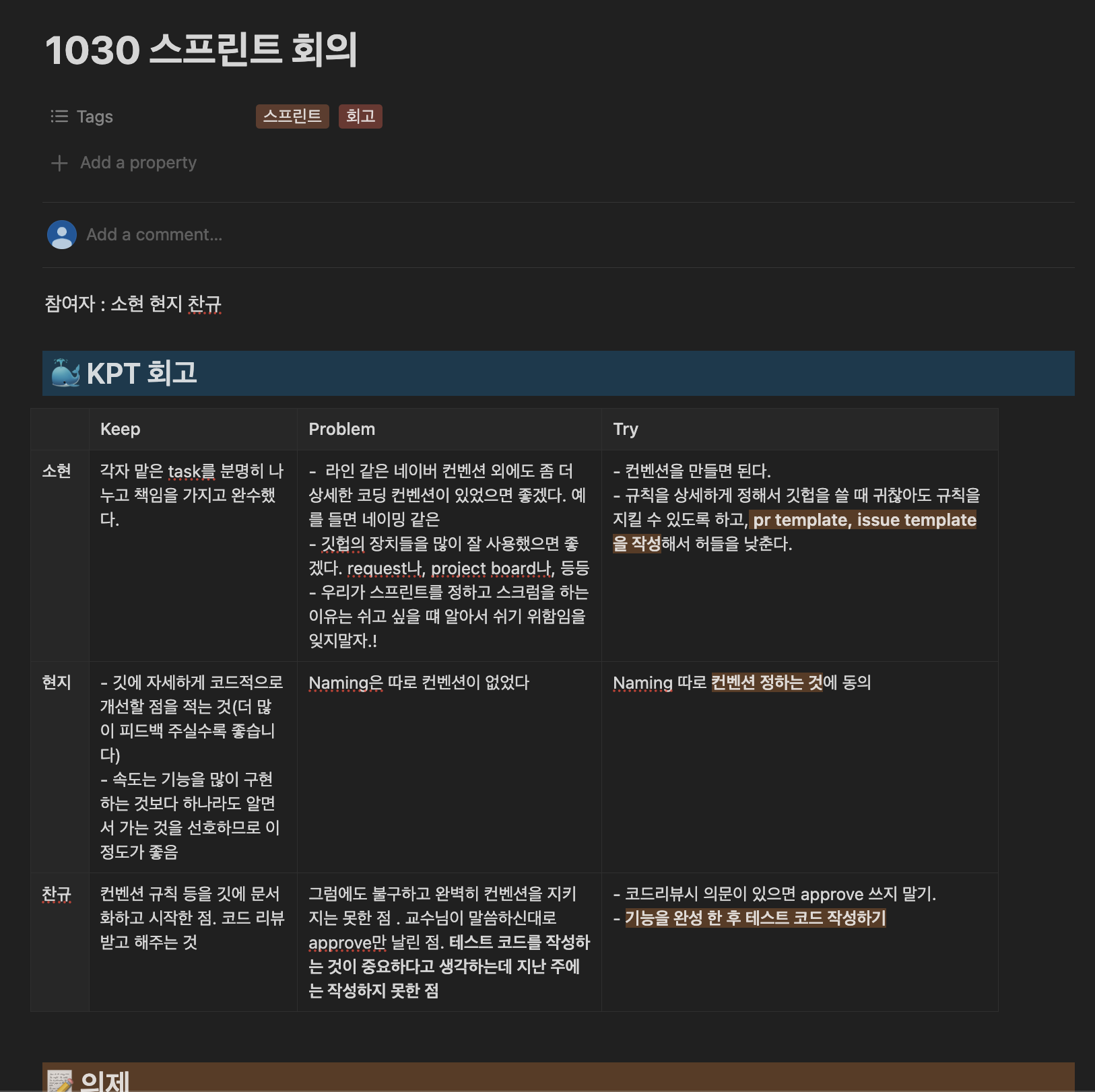 그래서 앞으로 만약에 팀장이 되면 스프린트 주기를 총 프로젝트 시간 고려해서 현명하게 가져가서 팀원들이 적당한 성취감과 목표를 가질 수 있도록 하고, 진행 상황이 보이는 협업툴(github issue, project, pr)을 100% 활용하도록 독려해야겠다는 생각을 했다.