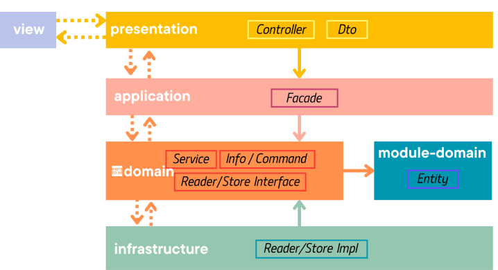 지금의 아키텍처 이전에는 물론 나름의 계층이랄까... 그냥 패키지랄까...ㅎㅎ 나눠져있긴했지만 책임이 불분명하여 서비스를 열고 나서 사용자의 피드백을 반영하거나 새로운 기능을 추가하게 되었을 때 수정해야 할 코드를 찾기 위한 시간이 불필요하게 소비되었고, 또 코드 수정으로 인한 사이드 이펙트를 예상하기 어렵다는 문제를 겪게 되었다. 그래서 우리는 계층별로 명확한 책임을 나누어 서비스에 대한 유지보수성을 높이고자 하였다.