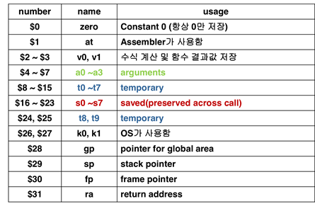 in MIPS, 레지스터의 각 칸은 나름의 각자 역할이 있다.