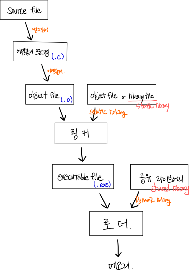 ** 링커 : 여러 object file 및 library file 을 하나의 executable file로 만든다.