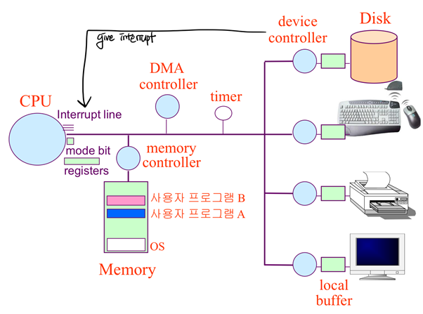 이 수행중에 IO작업이 끝나 interrupt line에 신호를 보내면 강제적으로 OS에 CPU제어권이 넘어간다.