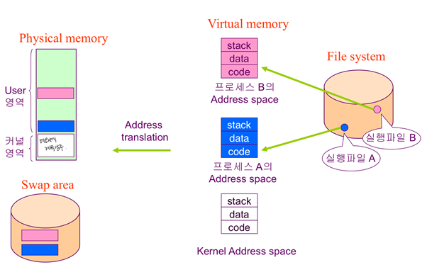 * 커널은 항상 상주하는 영역이고 사용자 프로그램은 실행 후에 사라지는 영역