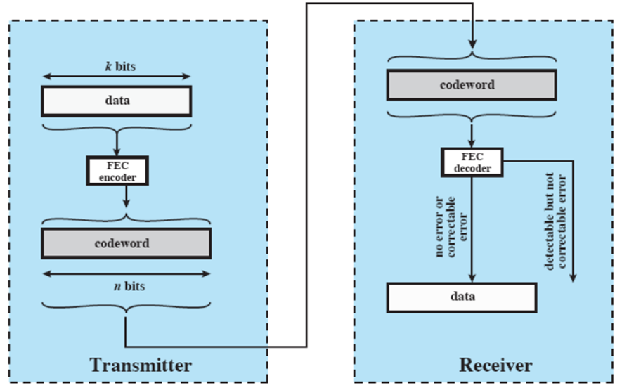• 각 k-비트 블록은 FEC(Forward Error Correction) 인코더를 사용하여 코드 워드라고 불리는 n-비트 블록(n >k)에 매핑된다.